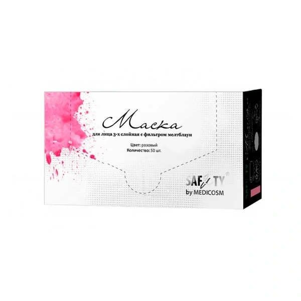 Маска защитная Safety розовая, 50 шт, коробка, 3-слойная, мелтблаун