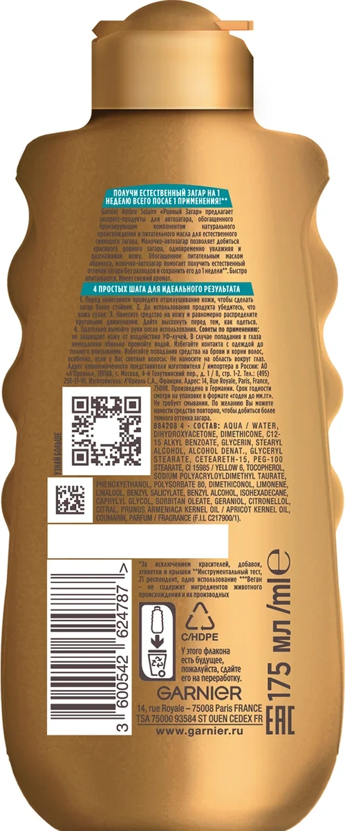 Получи естественный загар на 1 неделю всего за 1 час. Гамма Garnier Ambre Solaire Ровный Загар предлагает экспресс-продукты для автозагара, обогащенного бронзирующий компонентом 100% натурального происхождения и питательного масла для естественного сияющего загара. Молочко-автозагар позволяет добиться красивого ровного загара, одновременно увлажняя и разглаживая кожу. Обогащённое питательным маслом абрикоса, молочко-автозагар помогает получить естественный оттенок загара без разводов и сохранить его до 1 недели. Быстро впитывается. Имеет свежий аромат. Оно придает коже сияние, необычайную мягкость и по-летнему приятный кокосовый аромат. Подходит для тех, кто желает приобрести более интенсивный загар.