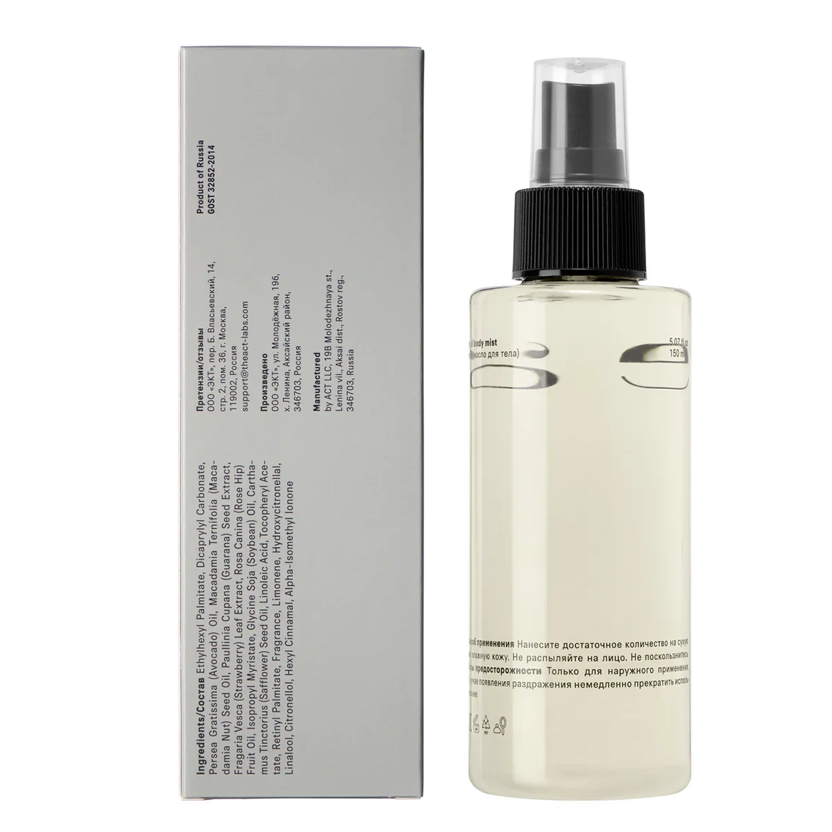 Сухое масло-мист - perfect match для тех, кто не любит ощущение жирности на теле, но нуждается в питании и увлажнении. Сухое масло-мист - мечта для тех, кто хочет иметь гладкую и упругую, увлажненную кожу, при этом стремится не применять слишком жирные средства. Легкий спрей возвращает коже здоровое сияние и эластичность, делает ее светящейся изнутри, при этом не оставляет липкости и жирности. Формула миста содержит масла авокадо, макадамии и шиповника, которые обеспечивают эффективное питание, ускоряют процессы обновления клеток. Сафлоровое масло из дикого шафрана омолаживает кожу, укрепляет ее липидный барьер и борется с сухостью. Экстракты гуараны и клубничного листа, витамин E защищают от вредного влияния окружающей среды, оказывают антиоксидантное действие.