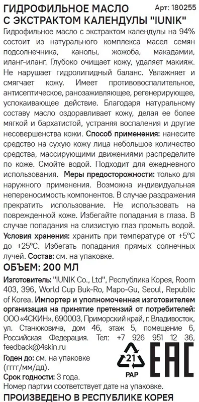 Масло гидрофильное Iunik с экстрактом календулы, 200мл