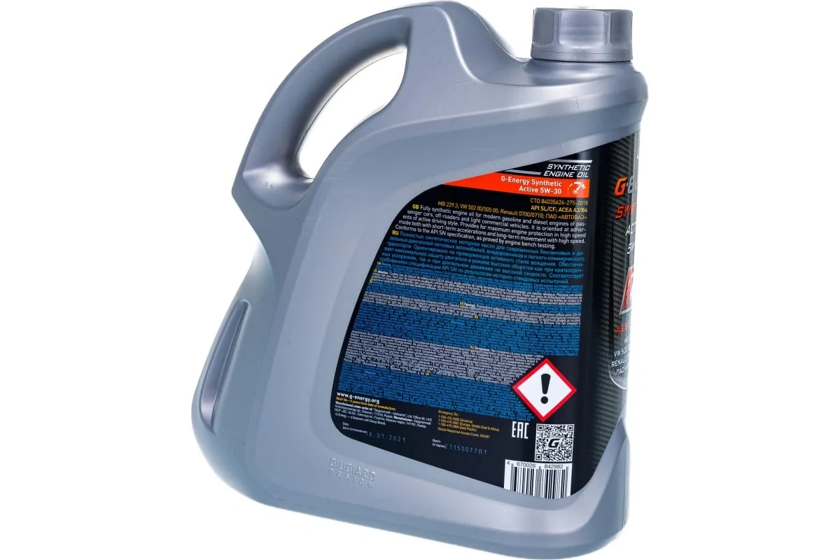 Масло моторное G-Energy Synthetic Active 5W-30, 4л - синтетическое моторное масло на основе базовых компонентов G-Base для бензиновых и дизельных двигателей. Предназначено для эффективной работы и максимальной защиты двигателя при активном использовании автомобиля, включая резкие ускорения, движение как в условиях города, так и в режиме трассы. Для легковых автомобилей, легких внедорожников, микроавтобусов и легких грузовых автомобилей. Для бензиновых и дизельных двигателей (с турбонаддувом и без) широкого парка автомобилей, где требуется вязкость SAE 5W-30, и необходим уровень эксплуатационных свойств ACEA A3/B4, API SL/CF и ниже. Не рекомендуется для применения в двигателях, оборудованных сажевыми фильтрами (DPF). Преимущества: - Отличная защита двигателя при активной манере езды (город/трасса, резкие ускорения в режиме стоп/старт) за счет стабильности масляной пленки. - Предотвращение образования отложений при повышенных температурах во всех режимах эксплуатации. - Максимальная защита двигателя на высоких оборотах: как при краткосрочных ускорениях, так и при длительном движении на высокой скорости. - Эффективно нейтрализует нежелательные продукты сгорания при повышенном потреблении топлива в условиях активной эксплуатации автомобиля. - Сохранение чистоты деталей двигателя благодаря предотвращению образования отложений и высоким моющим свойствам.