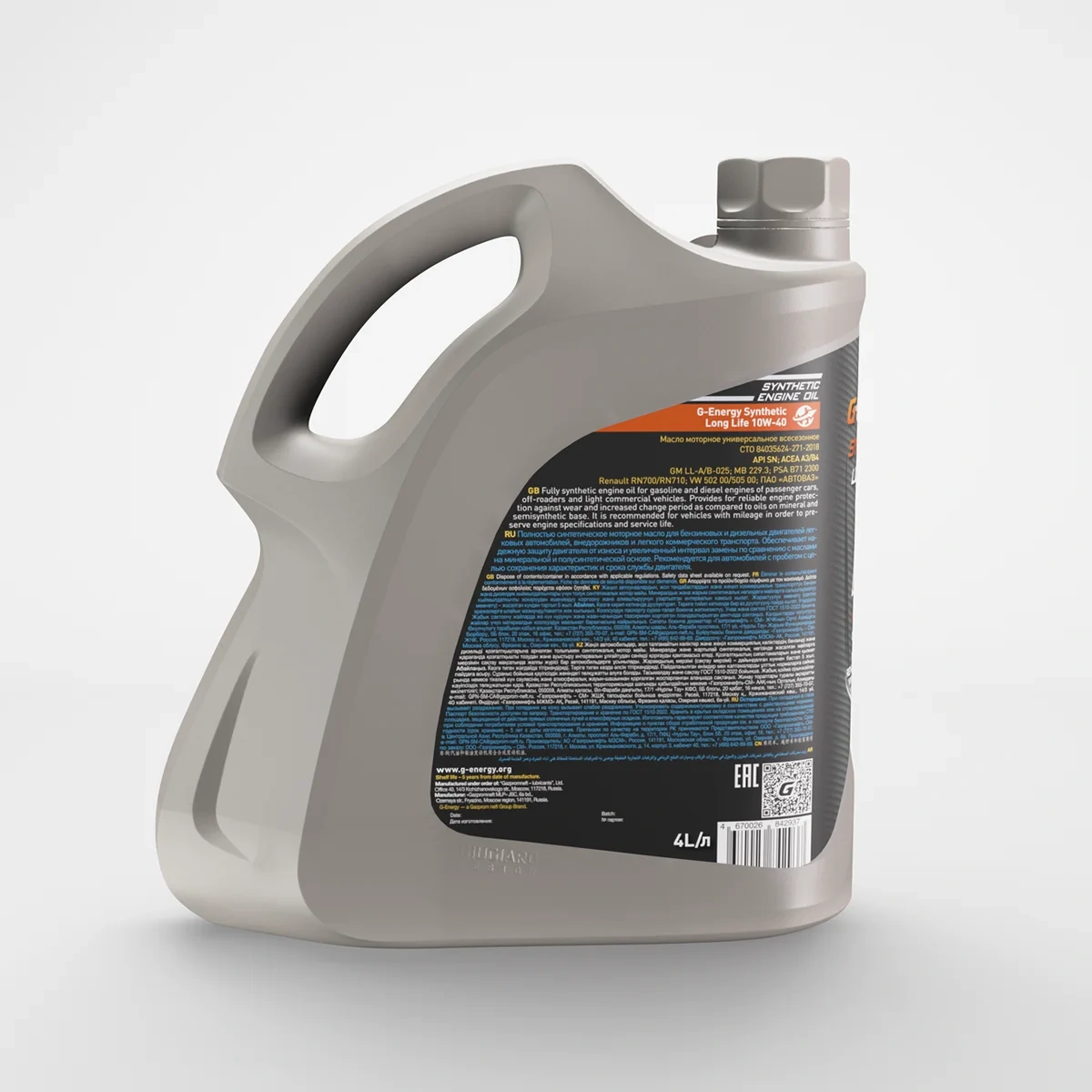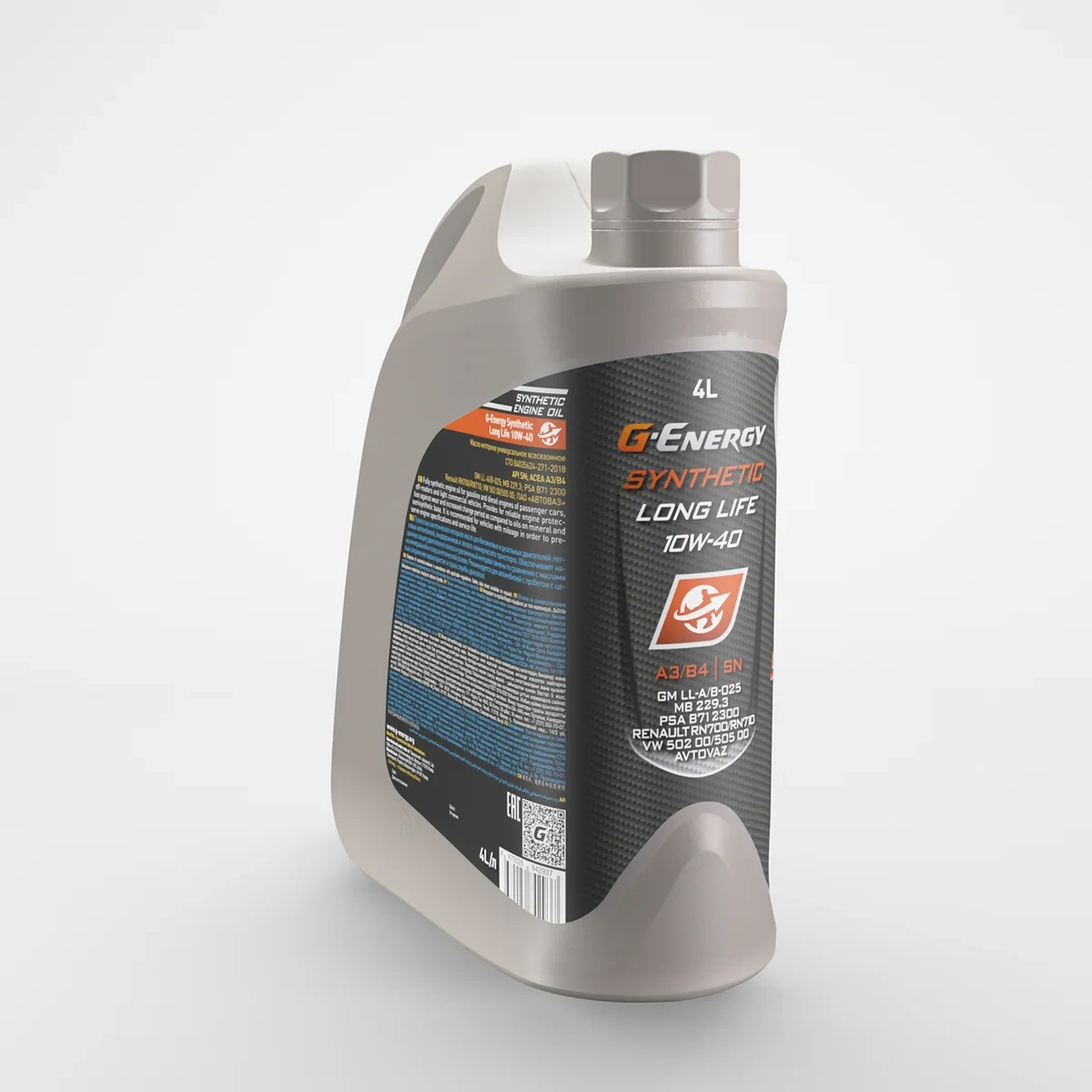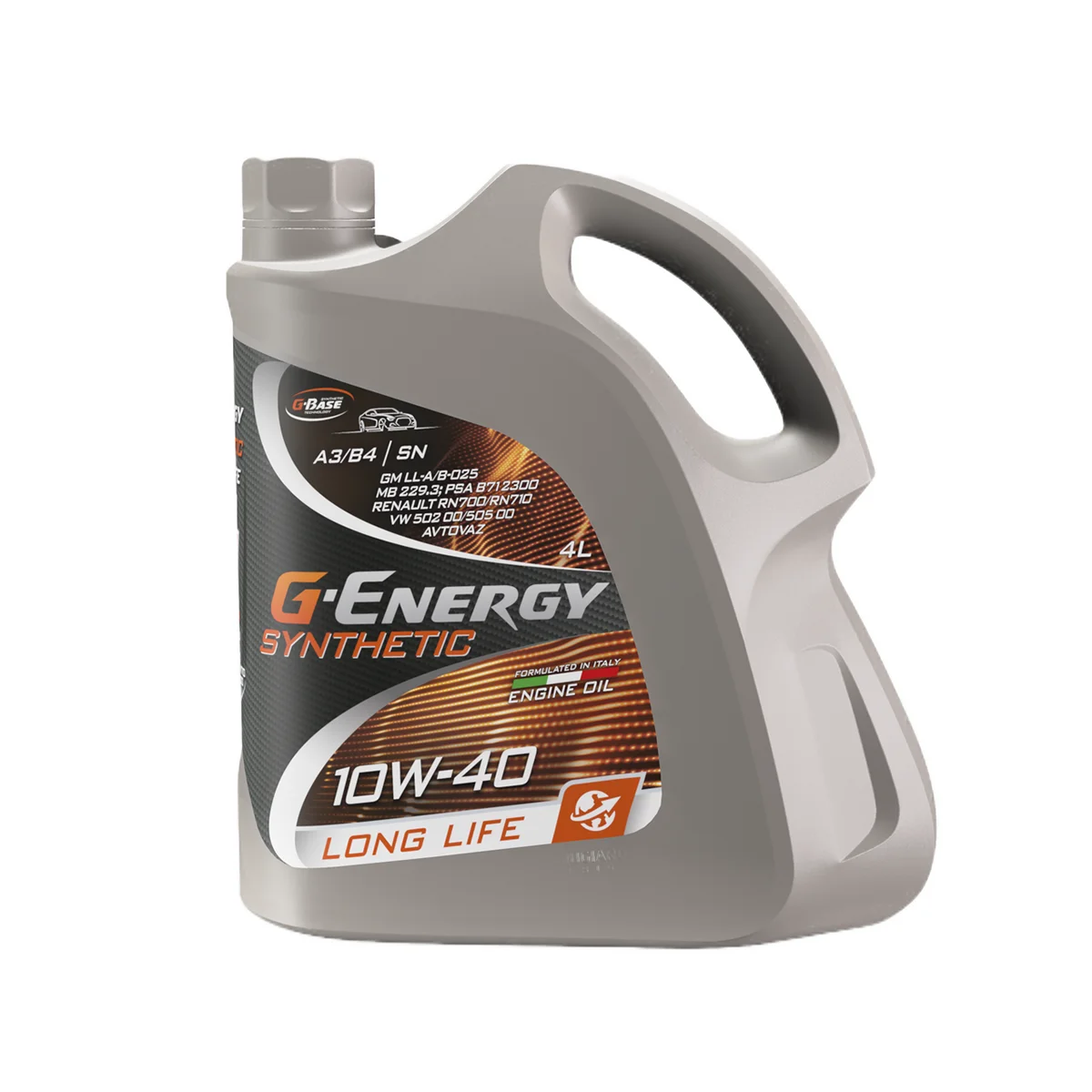 Масло моторное G-Energy Synthetic Long Life 10W-40, 4л - синтетическое моторное масло на основе базовых компонентов G-Base для бензиновых и дизельных двигателей автомобилей. Благодаря надёжной защите деталей от износа и низкому расходу на угар позволяет увеличить интервалы между заменами масла и сохранить ресурс двигателя по сравнению с маслами на минеральной и полусинтетической основе класса API SL и ниже. Поддерживает чистоту двигателя. Для легковых автомобилей, легких внедорожников, микроавтобусов и легких грузовых автомобилей. Для бензиновых и дизельных двигателей (с турбонаддувом и без) широкого парка автомобилей, где требуется масло класса вязкости SAE 10W-40 и уровня эксплуатационных свойств ACEA A3/B4, API SN/CF.Для автомобилей, где требуются масла уровня API SL/CF или ниже с целью повышения эффективности и максимальной защиты двигателя и сохранения его ресурса. Не рекомендуется для применения в двигателях, оборудованных сажевыми фильтрами (DPF). Синтетический продукт, соответствующий требованиям API SN, – оптимальное решение для двигателей, где требуется вязкость SAE 10W-40 (согласно рекомендациям автопроизводителя). Возможность увеличения интервала замены по сравнению с маслами уровня API SL на минеральной или полусинтетической основе согласно рекомендациям автопроизводителя. Поддерживает чистоту двигателя, нейтрализует негативное влияние топлива переменного качества. Надёжно защищает от износа, позволяя экономить на внеплановых ремонтах. Сохраняет ресурс работы и срок службы двигателя благодаря стойкости к образованию как низкотемпературных, так и высокотемпературных отложений.