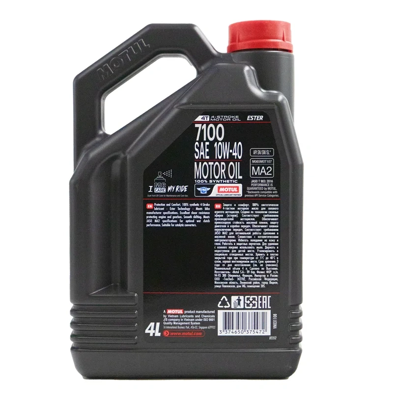 Высокотехнологичное моторное масло для 4-х тактных двигателей мотоциклов. 100% синтетическое, на основе сложных эфиров (эстеров). Применяется для специфических двигателей SUZUKI, YAMAHA, KAWASAKI, требующих масла с соответствующим классом вязкости. Спецификации: API SP, JASO MA2. Идеально подходит для мотоциклов с системами доочистки выхлопных газов, такими как каталитические нейтрализаторы или впрыск вторичного воздуха. Предназначен для тяжелых условий спортивной и туристической езды. Другие области применения: квадроциклы, внедорожники UTV, SXS, личные плавсредства (PWC) или снегоходы в зависимости от рекомендаций производителя по вязкости.