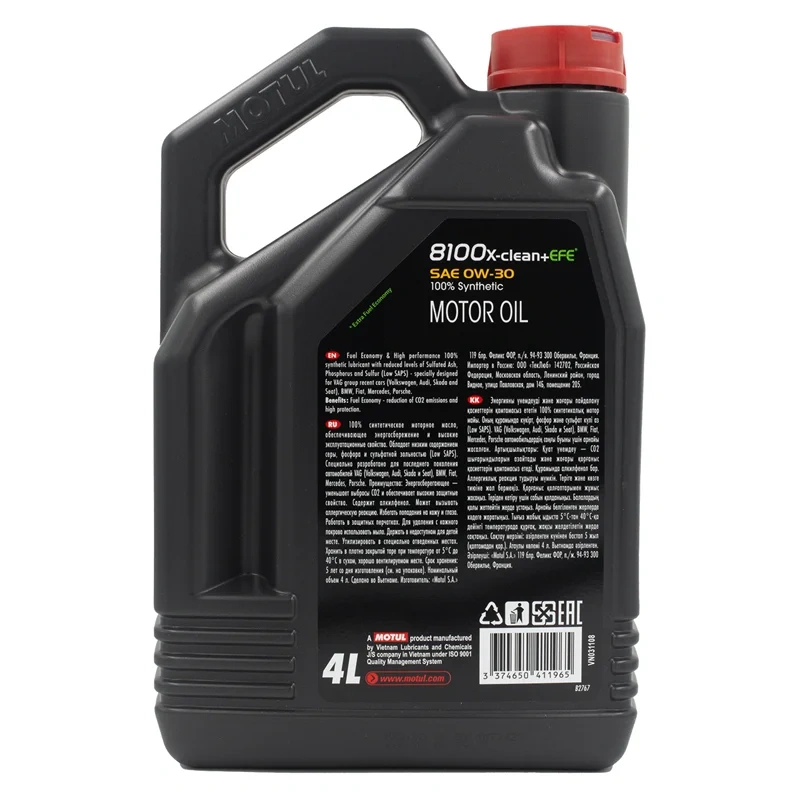 Масло моторное Motul 8100 X-Clean+ EFE 0W30, 4л - высокоэффективное 100% синтетическое масло, специально разработанное для дизельных и бензиновых двигателей последнего поколения, соответствующих нормам EURO IV, EURO V и EURO VI, для которых требуется моторное масло SAE 0W30 ACEA C3 с высокой вязкостью и Mid SAPS. Одобрено и рекомендовано моторное масло для автомобилей BMW, CHRYSLER, FIAT, MERCEDES, PORSCHE и VAG (VW, Audi, Seat, Skoda) последнего поколения благодаря свойствам EFE - Extra Fuel Economy. Стандарты ACEA C3 одобрения BMW LL-04 MERCEDES-BENZ MB-Approval 229.52 PORSCHE C30 VW 504 00 507 00. Соответствие требованиям FIAT 9.55535-S3, CHRYSLER MS 11106. Преимущества: - Имеет усовершенствованную синтетическую основу в сочетании со специальными модификаторами трения и уровнем сульфатной? зольности, фосфора и серы (SAPS), которые обеспечивают превосходную стойкость масляной? пленки, снижают трение в двигателе и обеспечивают совместимость с устройствами доочистки отработавших газов; - Обладает высокими смазывающими, противоизносными свойствами, и высокой? термостойкостью, что позволяет уменьшить расход масла на угар; - Обеспечивает увеличенные интервалы замены, контролируемые бортовым компьютером автомобиля; - Класс вязкости 0W-30 минимизирует гидродинамические потери на трение, обеспечивая энергосберегающие свойства, особенно при низкой? температуре масла; - Улучшает подачу масла при запуске, ускоряет повышение давления масла, ускоряет увеличение оборотов и достижение рабочей? температуры. Данное моторное масло снижает негативное воздействие на окружающую среду, позволяя снизить расход топлива и, следовательно, свести к минимуму выбросы парниковых газов (CO2).