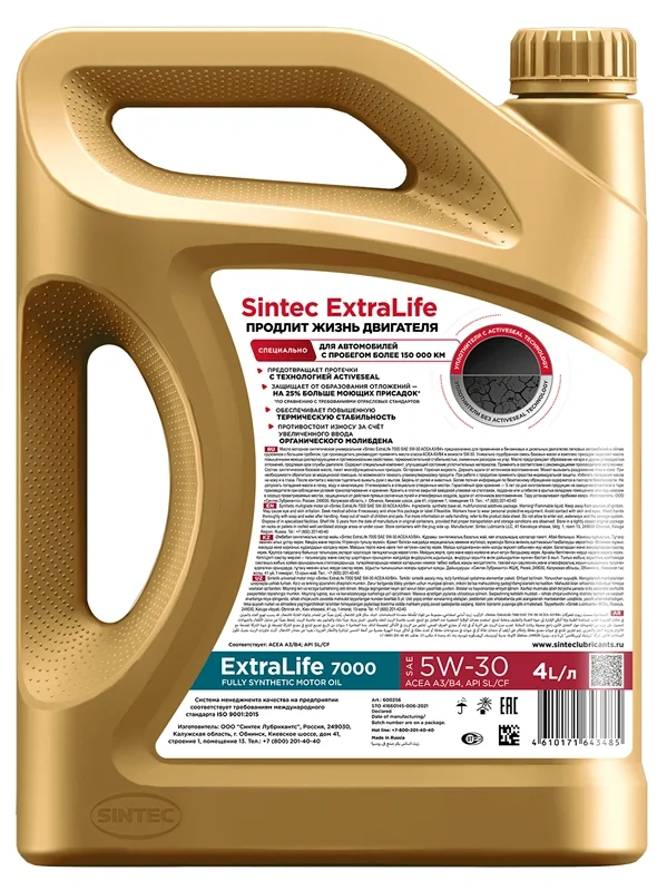 Синтетическое моторное масло Sintec ExtraLife 7000 5W-30 A3/B4 SL/CF разработано специально для автомобилей с большим пробегом. Увеличенное содержание противоизносных присадок, высокая термоокислительная стабильность и запас моющих свойств способствуют уменьшению износа двигателей с пробегом более 150 00км. Технология ActiveSeal позволяет предотвратить протечки за счёт добавления специального кондиционера, сохраняющего эластичность резиновых уплотнений.