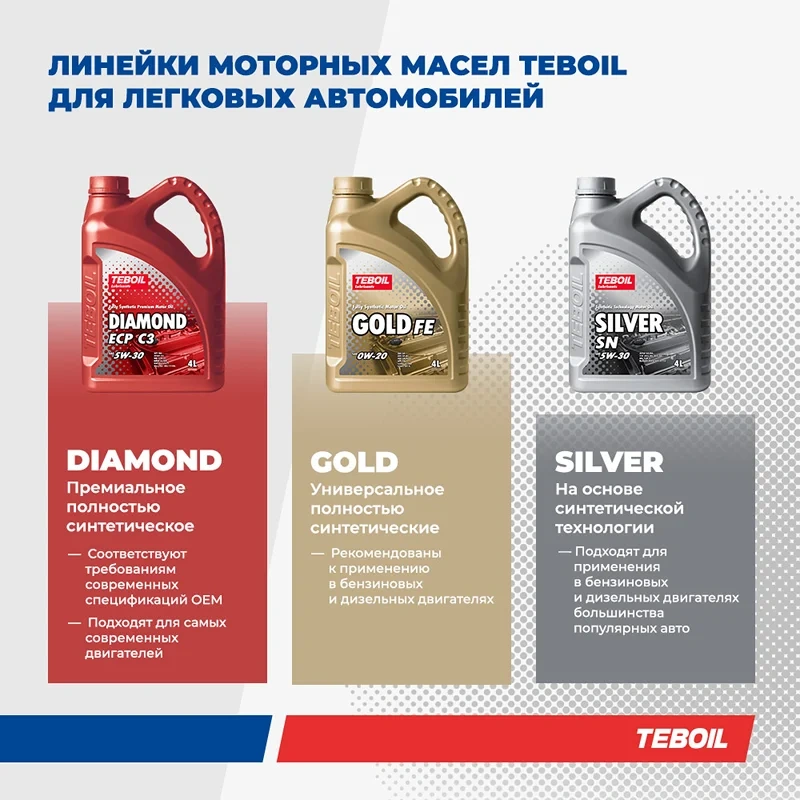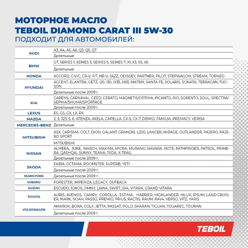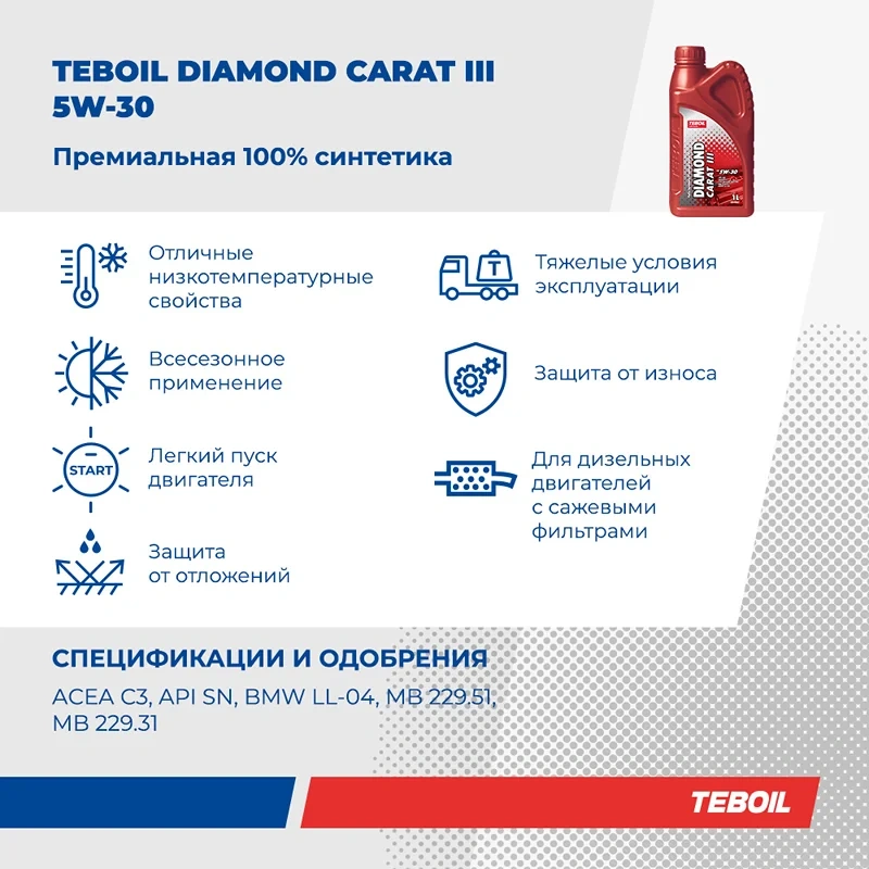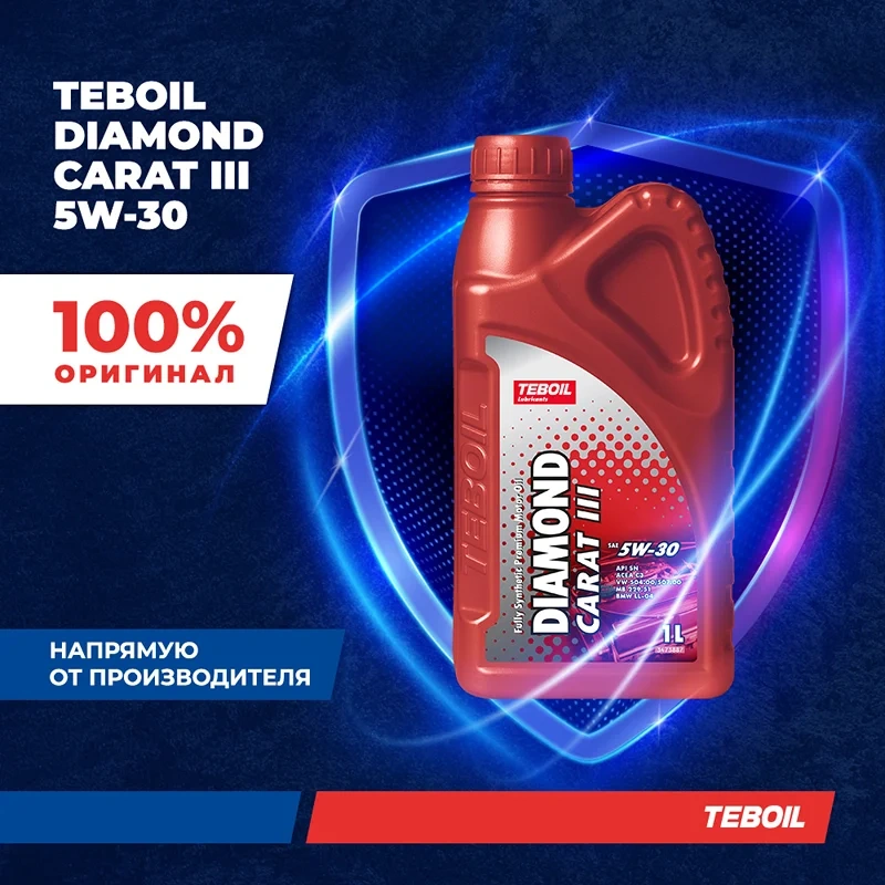 Полностью синтетическое моторное масло с увеличенным интервалом замены для бензиновых и дизельных двигателей легковых автомобилей, в том числе оборудованных турбонаддувом и системами доочистки выхлопных газов (каталитическими нейтрализаторами и фильтрами сажевых частиц). Teboil Diamond Carat III 5W-30 обеспечивает отличную защиту двигателя от износа в жестких условиях эксплуатации, а исключительно стабильный загуститель сохраняет эффективные вязкостно-температурные свойства моторного масла в течение всего срока эксплуатации. Бензиновые, дизельные и газовые двигатели легковых автомобилей и легкого коммерческого транспорта. Подходит для двигателей с турбонаддувом, системой прямого впрыска топлива, сажевыми фильтрами (DPF) и каталитическими нейтрализаторами.