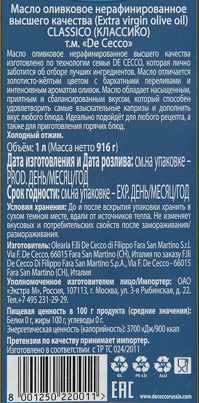 Масло оливковое DE CECCO Extra virgin 100% — это нерафинированный продукт, изготовленный путем первого холодного отжима методом механического прессования. Оно состоит исключительно из отборных оливок, выращенных в Италии. Современные технологии производства позволяют сохранять в готовом продукте все первоначальные полезные свойства, придают приятный золотисто-зеленый цвет и сбалансированный вкус. Оливковое масло DE CECCO отличается низкой кислотностью и подходит для людей, соблюдающих строгую диету. Производитель рекомендует хранить продукт в темном месте, несмотря на бутылку из непрозрачного стекла, защищающего его от пагубного воздействия солнечных лучей. Производитель: F.lli De Cecco di Fillipo Fara San Martino S.p.A., Италия.Состав: 100% натуральное нерафинированное оливковое масло первого холодного прессования.Пищевая ценность: жиры — 91,6 г.Энергетическая ценность: 824 ккал. Срок годности: 18 месяцев.