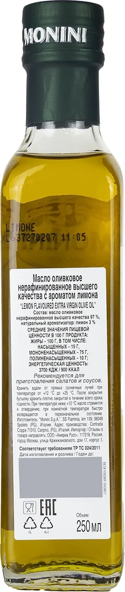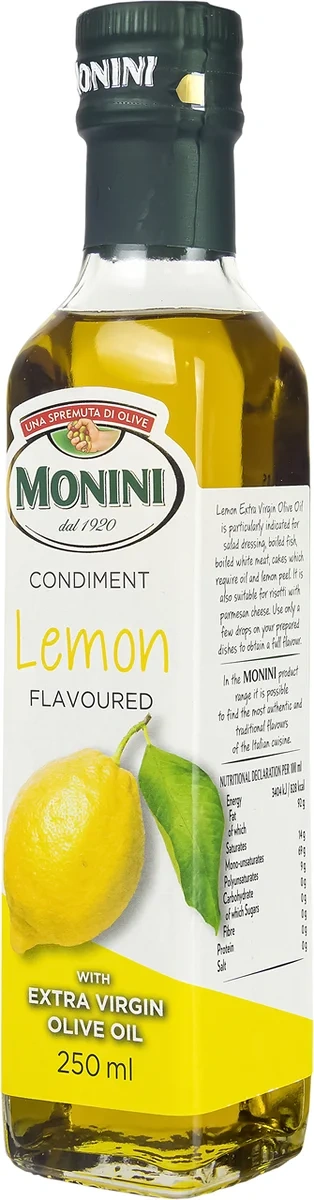 Масло оливковое Monini Extra Virgin с лимоном — это традиционный итальянский продукт, полученный методом первого холодного прессования. Он обладает бодрящим цитрусовым вкусом и запахом, поэтому подходит для салатов из зелени, мяса и овощей, а особенно для блюд из рыбных деликатесов Средиземноморья. Производитель не рекомендует использовать такое масло для жарки, потому что после термической обработки оно теряет свои полезные первоначальные характеристики. Состав продукта насыщен олеиновыми, линолевыми и другими аминокислотами, которые помогают снизить вероятность развития заболеваний сосудов и сердца при регулярном употреблении оливкового масла Extra Virgin внутрь.