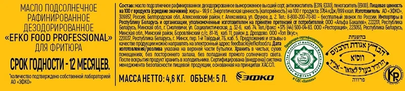 Масло подсолнечное Efko Food Professional Для фритюра рафинированное дезодорированное, 5л