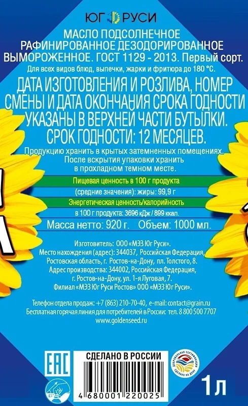 Масло подсолнечное рафинированное дезодорированное Золотая семечка. Производится из отборных семян подсолнечника и идеально подходит для домашней кухни. Рафинированное, дезодорированное, вымороженное. Очищено от примесей и не имеет запаха. Можно использовать как для заправки салатов и приготовления соусов, так и для термической обработки, включая выпечку и фритюр (максимум при 180С). Хороший источник витамина Е. Рекомендуется для непосредственного употребления в пищу: жарки, домашнего консервирования, приготовления салатов, соусов и других блюд.