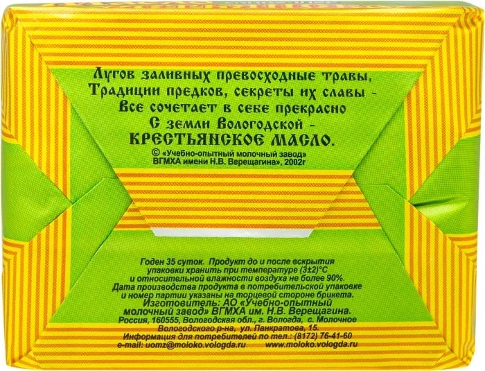 Крестьянское сливочное масло «Из Вологды» – это восхитительный продукт питания с традиционным вкусом, который создаётся из отборных свежих сливок. Сливочное изделие превосходно в качестве основы соусов и десертов, а также будет незаменимо во время приготовления вкусных гарниров. Современные технологии взбивания делают масло невероятно мягким и податливым, благодаря чему оно легко намазывается на хлеб. Не содержит ГМО и иных вредных добавок.