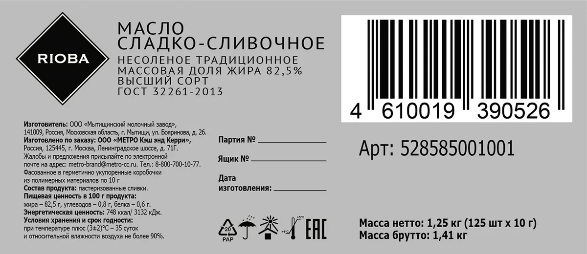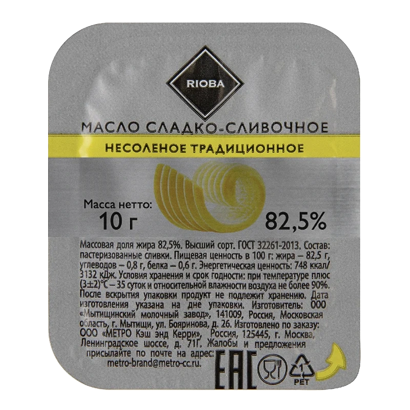 Rioba Масло сливочное 82.5%, 10г х 125шт БЗМЖ(без заменителя молочного жира) сочетает в себе всю сил...