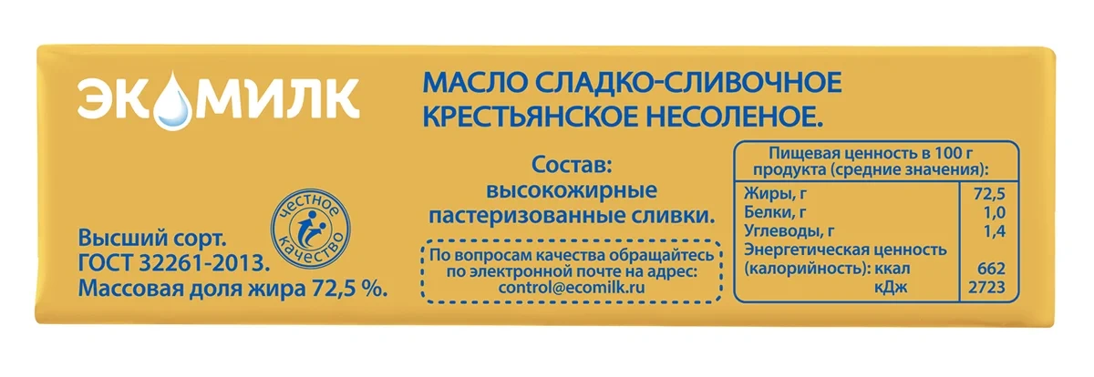 Масло сливочное Экомилк Крестьянское ГОСТ 72.5%, 160г