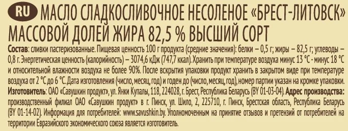 Масло Брест-Литовск изготавливает только из свежих сливок без добавления растительных жиров и консер...