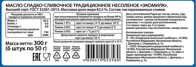 Масло сливочное Экомилк Традиционное ГОСТ 82.5% (50г x 6шт), 300г