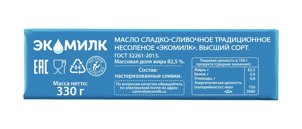 Масло сливочное Экомилк Традиционное ГОСТ 82.5%, 330г