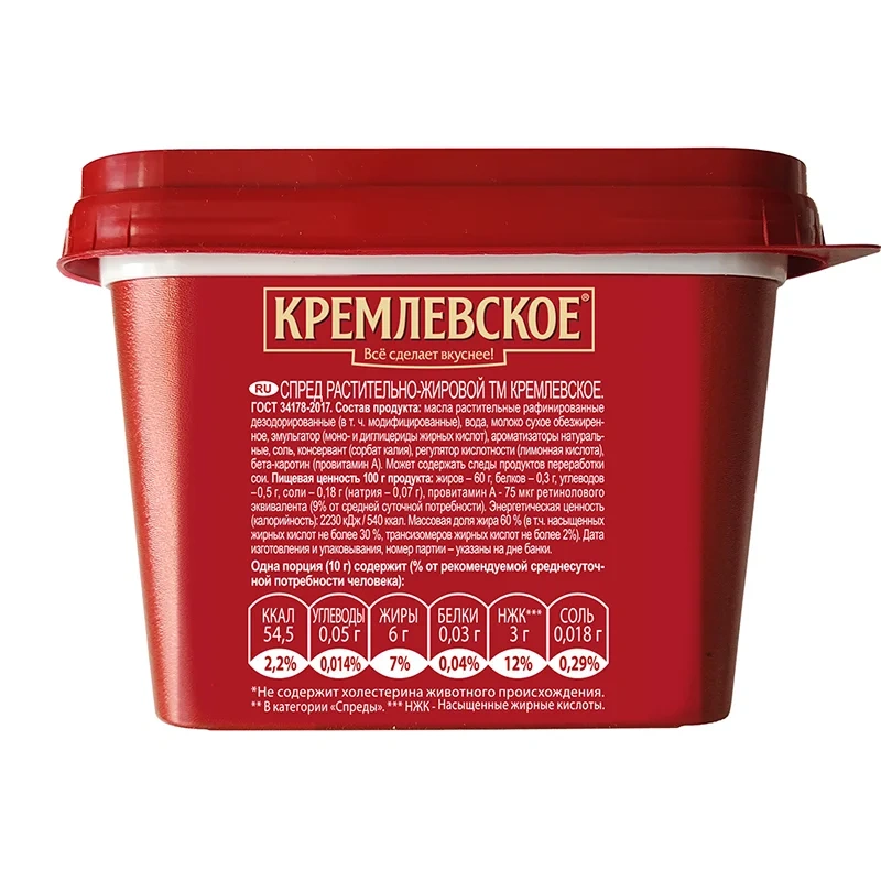 Спред Кремлевское 180г – пищевой продукт, изготовленный на основе растительных жиров с добавлением с...