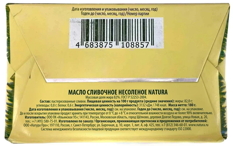 | Вид сливочного масла | традиционное; несоленое |
