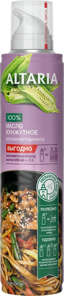 Масло-спрей кунжутное Altaria нерафинированное, 250мл уникальный ЭКО-продукт, который сделает ваши блюда еще вкуснее и полезнее. Производится из белых кунжутных семян методом первого холодного прессования и подвергается тщательной очистке с помощью новейших технологий. Прекрасно подойдет для добавления в блюда индийской и азиатской кухни, а также для приготовления салатов, соусов, десертов, закусок. Обратите внимание: это масло не следует подвергать термической обработке. Инновационная вакуумная упаковка исключает контакт продукта с воздухом и солнечными лучами, а значит не дает ему окисляться и сохраняет все ценные свойства. Распылитель обеспечивает более экономичный расход: при ежедневном употреблении такого флакона вам хватит на 2-3 месяца. Дозатор имеет три режима распыления (капля, струя и веер).