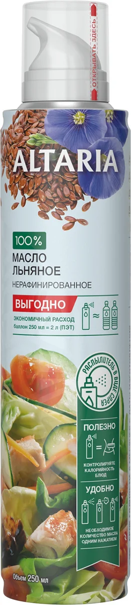 Масло-спрей льняное Altaria нерафинированное, 250мл уникальный ЭКО-продукт, который сделает ваши блюда еще вкуснее и полезнее. Производится из семян льна методом первого холодного прессования и подвергается тщательной очистке с помощью новейших технологий. Гармонично сочетается с картофелем, свеклой, бобовыми, злаками, мягкими сырами, хумусом, рыбными и мясными блюдами. Отлично подойдет для заправки салатов. Обратите внимание: это масло не следует подвергать термической обработке. Инновационная вакуумная упаковка исключает контакт продукта с воздухом и солнечными лучами, а значит не дает ему окисляться и сохраняет все ценные свойства. Распылитель обеспечивает более экономичный расход: при ежедневном употреблении такого флакона вам хватит на 2-3 месяца. Дозатор имеет три режима распыления (капля, струя и веер).