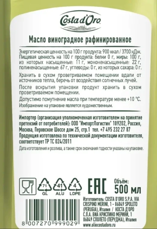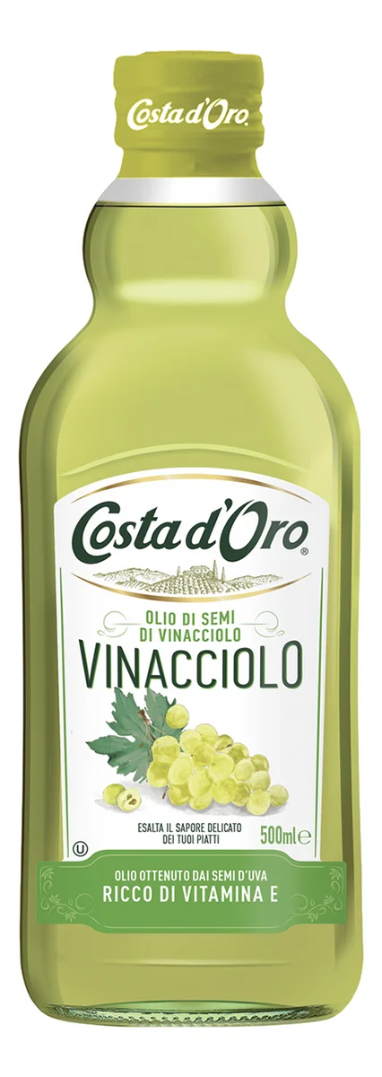 Рафинированное масло из виноградных косточек Costa d'Oro произведено из плодов итальянских плантаций. Продукт имеет прозрачный, слегка зеленоватый цвет, нейтральные вкус и аромат. Масло рекомендуется использовать в качестве заправки для салатов и каш. Стеклянная бутылка оснащена удобным пластиковым дозатором.