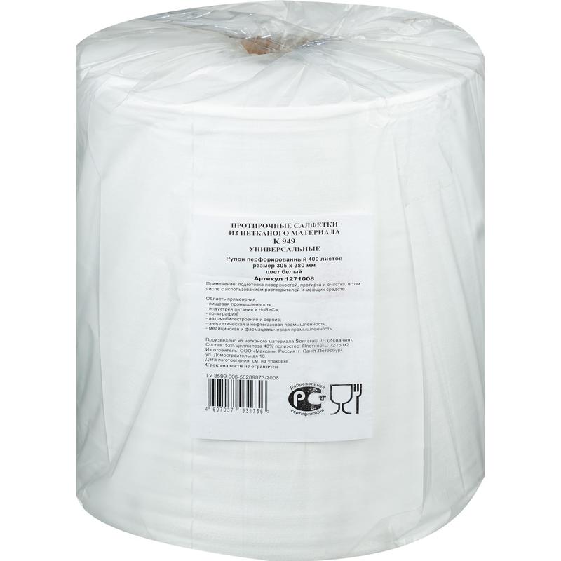 Рулон перфорированный 400 листов, размер 30,5?38 см, цвет белый, плотность 72 гр/м.кв, состав 52 % целлюлоза, 48 % полиэстер.