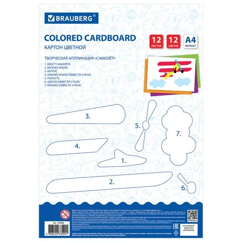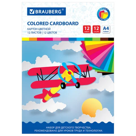 Картон цветной А4 немелованный, 12 листов 12 цветов, в папке, BRAUBERG, 200х290 мм, 'Самолет', 11355