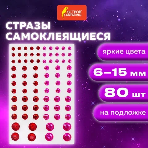 Стразы самоклеящиеся 'Круглые', 6-15 мм, 80 шт., розовые/красные, на подложке, ОСТРОВ СОКРОВИЩ, 6613
