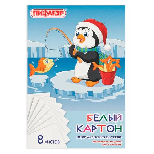 Картон белый А4 немелованный (матовый), 8 листов, в папке, ПИФАГОР, 200х290 мм, 'Пингвин-рыболов', 1