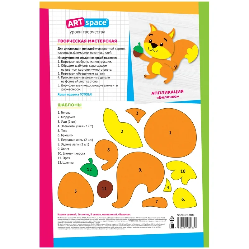 Картон цветной A4, ArtSpace, 16л., 8цв., мелованный, в папке, 'Белочка'