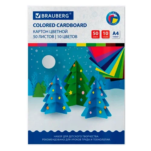 Цветной картон Brauberg 10 цветов, А4, 50 листов, немелованный