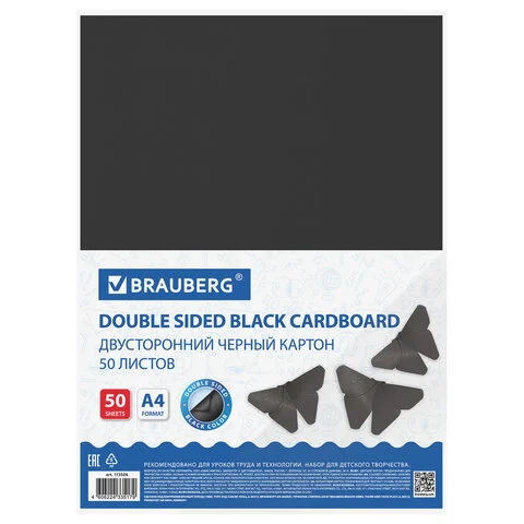 Картон цветной А4 ТОНИРОВАННЫЙ В МАССЕ, 50 листов, ЧЕРНЫЙ, в пленке, 220 г/м2, BRAUBERG, 210х297 мм,