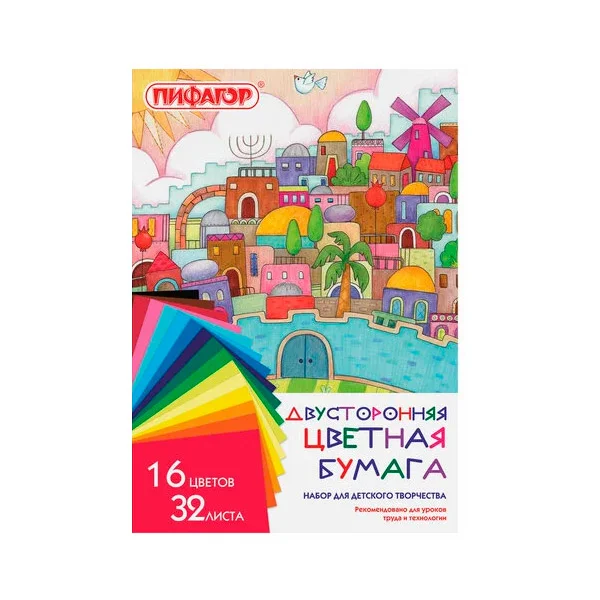 Цветная бумага А4 2-сторонняя газетная, 32 листа 16 цветов, на скобе, ПИФАГОР, 200х280 мм, 'Город',