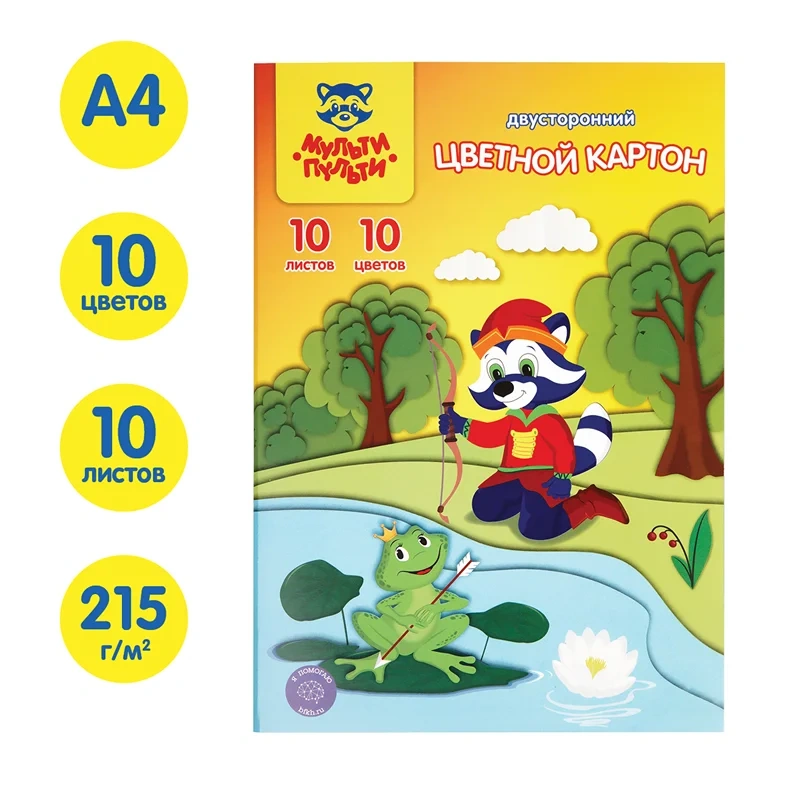 Картон цветной двустор. A4, Мульти-Пульти, 10л., 10цв., мелованный, в папке