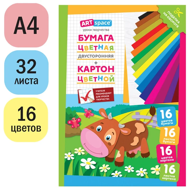 Набор цв. немел.картона 16л. и двусторон.газет.цв.бумаги 16л, A4, ArtSpace, в папке, 'Коровка'