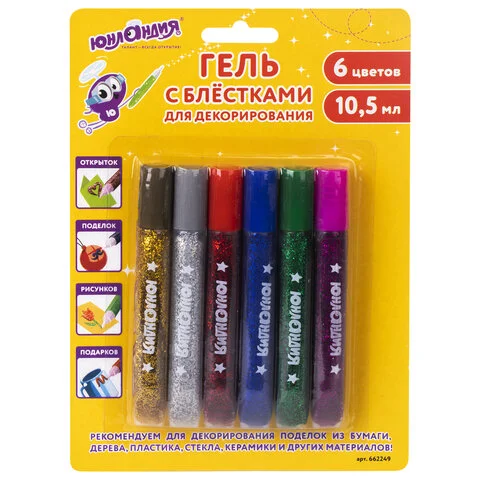 Гель с блестками ЮНЛАНДИЯ, 6 ярких цветов по 10,5 мл, блистер, 662249