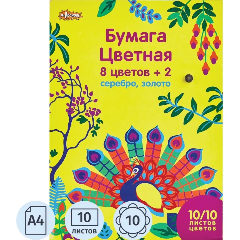 Бумага цветная №1School 10л.10цв.А4 офсет (золото+сереб) Отличник