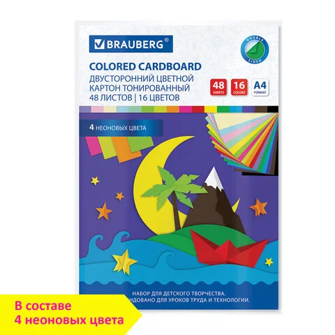Картон цветной А4 ТОНИРОВАННЫЙ В МАССЕ, 48 листов 16 цветов (+ неон), склейка, 180 г/м2, BRAUBERG, 1