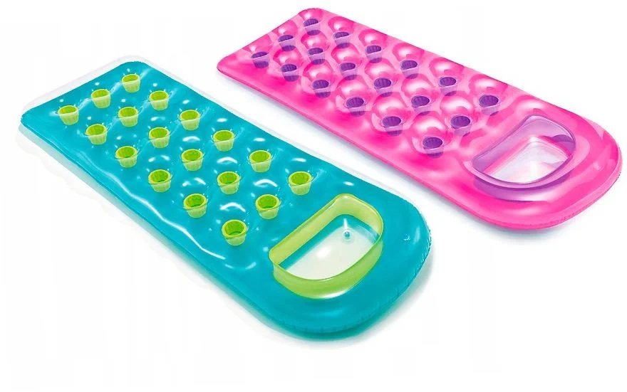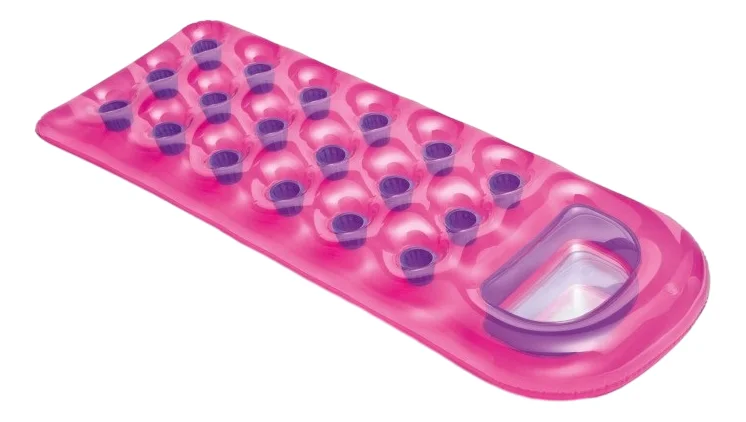 Прозрачная верхняя часть с цветными карманами. Окошко для наблюдения, прочная конструкции. Эргономичная подушка для большего комфорта. Данную модель можно использовать в воде любой жесткости. Матрас отлично держит пловца на воде, а подголовник позволяет занять более удобную позу. Не желателен контакт с острыми колющими и режущими предметами. В матрасе две воздушные камеры, которые не дадут плавучему средству утонуть даже в том случае, если одна из них спуститься. Надувной подголовник имеет I-Beam структуру внутренних перегородок и позволяет расслабить мышцы шеи. Может быть использован как летний спальный матрас. Надувной пляжный матрас для плавания имеет специальную систему поддержки, которая не позволяет матрасу сминаться. Надувной матрас изготовлен из высокопрочного винила.