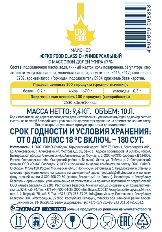 Майонез Efko Food Professional Провансаль 67%, 10л