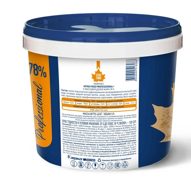 Изготовлен полностью из натуральных ингредиентов – свежего растительного масла, яиц и специй. Вкус и качество продукта сохранены благодаря уникальной рецептуре и инновационным технологиям. Не содержит искусственных консервантов, красителей, ароматизаторов и ГМО.