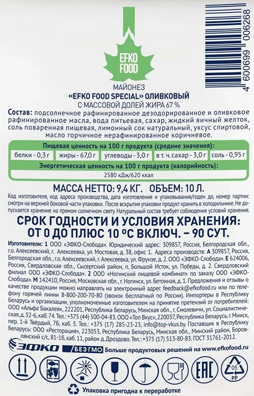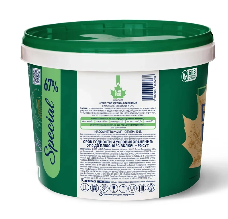 Майонез Efko Food Special оливковый настоящий ГОСТ 67%, 10л