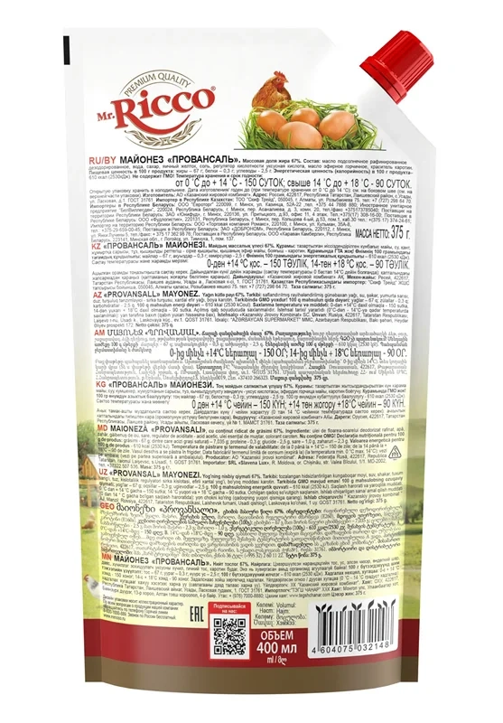 Майонез Mr. Ricco Провансаль 67%, 400 г – нежный натуральный продукт, изготовленный по уникальной рецептуре без использования вредных консервантов, искусственных ароматизаторов, красителей и ГМО. Состав на основе высококачественного оливкового масла дополнен яичным желтком, содержит провитамин А, который является естественным антиоксидантом. Майонез – популярный и универсальный соус, который идеально подходит для заправки разных салатов, мясных и рыбных блюд, закусок и хорошо сочетается с разными супами.