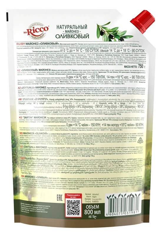 Майонез Оливковый Mr. Ricco 67%, 800 мл – соус из натуральных ингредиентов с традиционным изысканным вкусом. Он прекрасно подойдет для приготовления салатов и бутербродов. Также может подаваться как самостоятельный соус к блюдам из рыбы, мяса, овощей. Оптимальная жирность и богатый вкус оливкового масла первого отжима выгодно отличают продукт в сравнении с аналогами. Майонез не содержит искусственных консервантов, красителей, стабилизаторов и загустителей. Он совершенно безопасен для здоровья и подойдет даже для детского стола. Оливковое масло – богатый источник витамина E, который по праву называют витамином красоты и молодости.