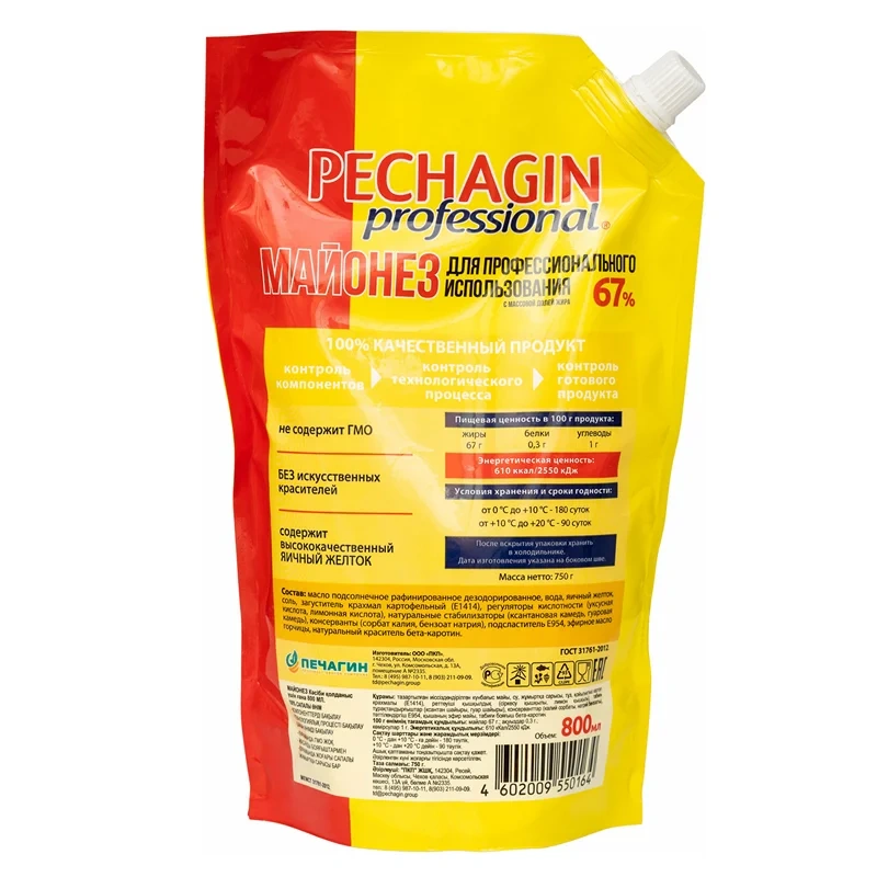 Майонез Pechagin Professional 67% дой-пак 800мл прекрасно подходит для заправки салатов и других блюд. Сбалансированный вкус и классическая, пользующаяся на протяжении многих лет популярностью, рецептура придаст любому блюду завершенность и добавит изысканные нотки в его вкус. Удобная расфасовка позволяет экономично использовать продукт. Майонез отличается густотой, приятным цветом и неповторимыми вкусовыми сочетаниями. С этим продуктом любое блюдо на вашем столе не останется незамеченным.