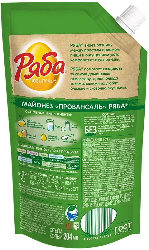 Майонез Ряба Провансаль - это классическое сочетание желтков, масла и горчицы. Это высококачественный продукт без крахмала и ГМО, универсальный соус, который отлично подходит для заправки салатов и супов, приготовления бутербродов и закусок. Высококачественный продукт, классический вкус. В нем натуральные ингредиенты: свежее растительное масло, яйца и специи и нет искусственных консервантов, красителей и ароматизаторов. Вкус и качество майонеза сохраняются благодаря уникальной рецептуре и инновационным технологиям изготовления. Продукт придаст изысканный вкус готовым блюдам. Подойдет для приготовления салатов, бутербродов, маринадов для мяса, рыбы, птицы.