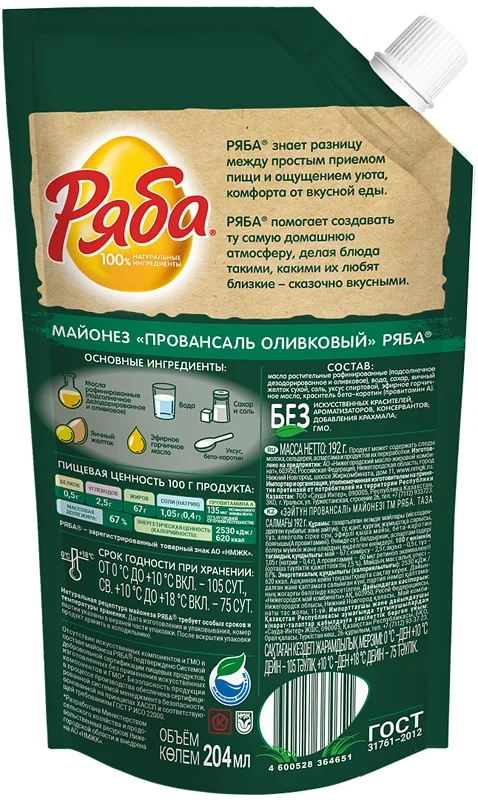 Майонез Ряба Провансаль оливковый ГОСТ 67%, 192г