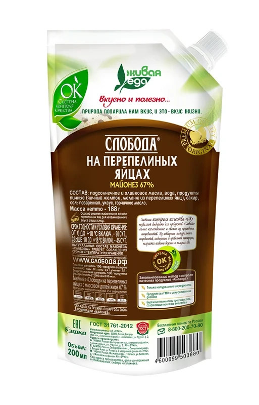 Слобода На Перепелиных Яйцах — классический майонез, дополненный пользой перепелиных яиц. В состав майонеза входят только натуральные ингредиенты, а свежие яичные желтки в рецептуре делают Слободу такой уникальной и неповторимой. Майонез на перепелиных яйцах обладает идеально сбалансированным вкусом и станет отличным дополнением к вашим любимым блюдам. Используйте его в качестве заправки для салата, маринада для рыбы и мяса, добавляйте в любимые бутерброды. Слобода объединяет вкус и пользу в одном продукте! Слобода — бренд, который знают и любят многие россияне уже на протяжении 30 лет. Все продукты Слобода отличаются настоящим вкусом и неизменным высоким качеством. Они не просто соответствуют ГОСТу, а обладают настоящей силой природы и производятся с заботой о будущем!