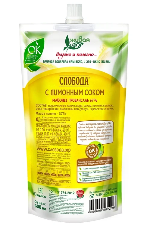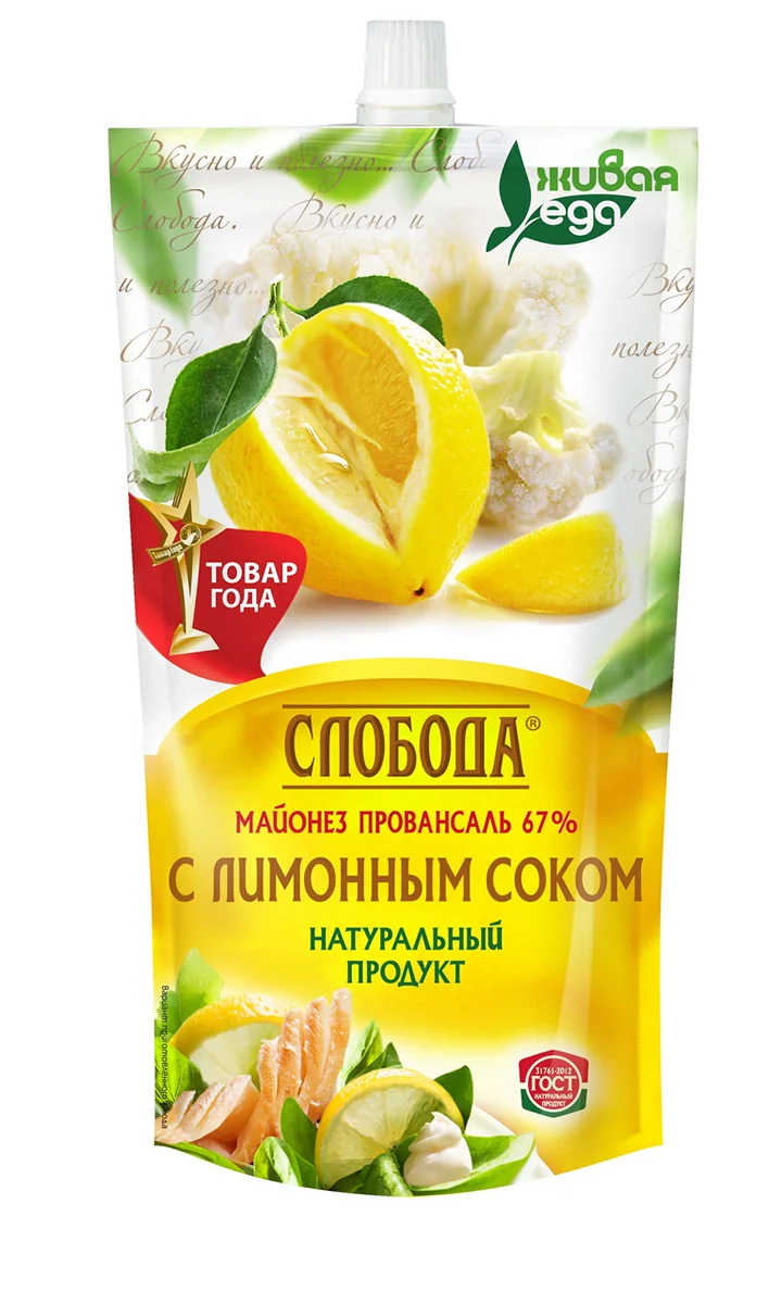 Слобода с Лимонным соком — яркий микс классического майонеза и сочного лимона. В состав майонеза входят только натуральные ингредиенты, а умеренная кислинка подчеркнет другие вкусы вашего блюда. Майонез с соком лимона прекрасно подходит для заправки салатов с морепродуктами и рыбой, сочетается с запеченной курицей или овощами, а также является идеальной основой домашних заправок и маринадов. Дайте волю кулинарной фантазии и удивляйте близких оригинальными рецептами! Слобода — бренд, который знают и любят многие россияне уже на протяжении 30 лет. Все продукты Слобода отличаются настоящим вкусом и неизменным высоким качеством. Они не просто соответствуют ГОСТу, а обладают настоящей силой природы и производятся с заботой о будущем!