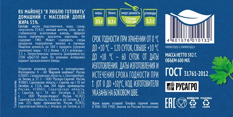 Майонез Я люблю готовить Московский провансаль Домашний 55%, 600мл обладает приятным запахом, густой консистенцией и идеально сбалансированной текстурой, благодаря строго продуманному количеству желтка, масла, уксуса и специй. Идеально подходит для приготовления закусок, канапе, салатов и вторых блюд.